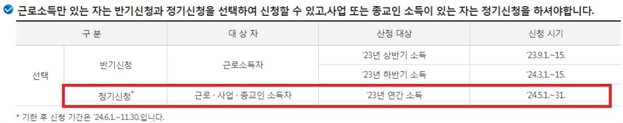 근로소득만 있는 가정은 반기신청과 정기신청을 선택하여 신청할 수 있습니다만, 사업 또는 종교인 소득이 있는 가정은 정기신청을 하셔야 합니다.