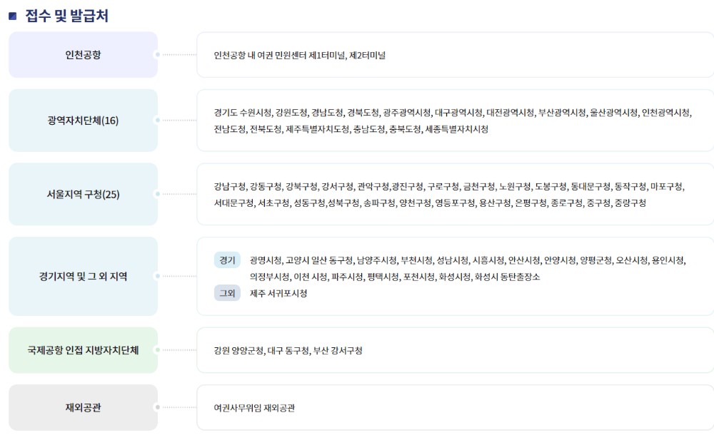 - 장소 : 제1 여객터미널 3층 출국장 G체크인 카운터 근처 여권민원센터 (외교부 여권 민원실)