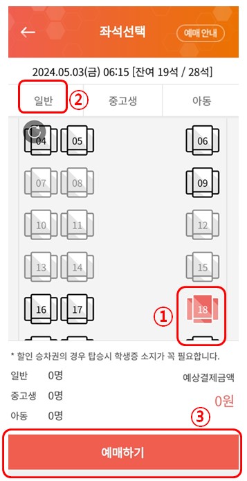 4. 희망하는 좌석을 선택한 뒤 상단의 일반(성인), 중고생, 아동을 선택하고 예매하기 버튼을 눌러 결제를 진행해 주세요.