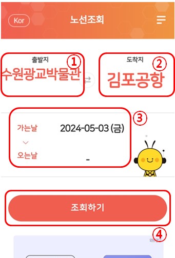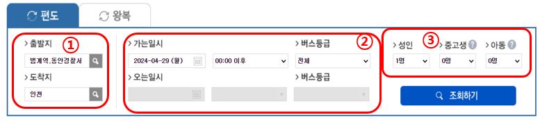 2. 편도 or왕복, 출발지& 도착지, 가는일 시 & 오는일 시, 버스등급과 인원수를 입력 후 조회하기 버튼을 눌러 주면