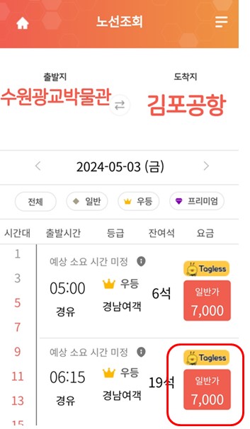 자동으로 예약이 가능한 승차권 리스트가 표시되니 그중에서 원하는 출발시간을 선택합니다.