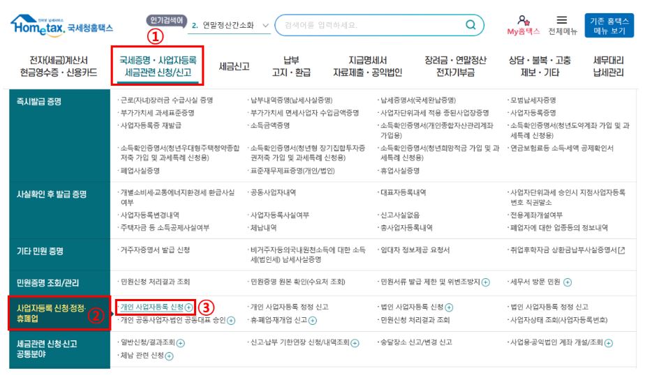 2. 화면 상단에 [국세증명. 사업자등록 세금 관련 신청/신고]를 선택하세요. ▷ [사업자등록증 신청. 정정. 휴폐업]을 선택하세요. ▷ [개입사업자등록 신청]을 선택하세요.
