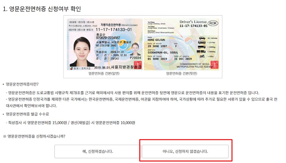 (8) 영문운전면허증 신청여부를 확인해 주세요. 해외출장이나 해외 여행시 운전명허증을 소지해야 할 경우, 운전면허증 뒷면에 영문으로 면허증의 내용을 표기해 준 영문운전면허증이 있다면 편리하겠지요? 만약, 해외에서 운전을 하실 계획이 없다면 굳이 신청하지 않아도 될 것 같습니다.