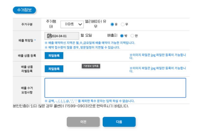 ▷ 수거 정보에 주거구분, 엘리베이터 유무, 배출희망일, 배출지가 밖인지 안인지를 선택하고 다음 버튼을 눌러 주세요.