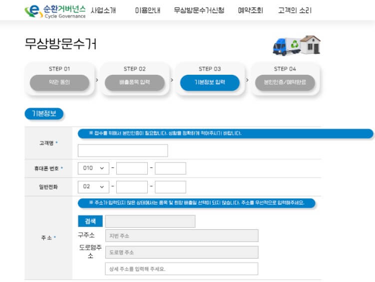3. 폐가전제품 무상방문수거를 위한 내 기본정보 [주소/전화번호/고객명]를 입력해 주세요.