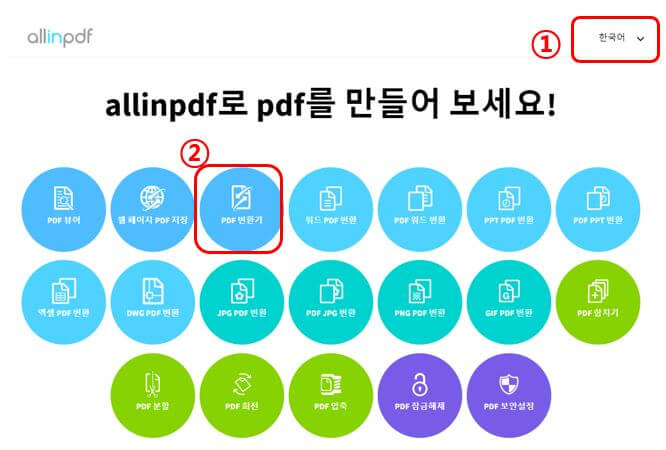 (2) 오른쪽 상단에 '한국어'로 변경해 주고, 맨 윗줄에서 'pdf변환기' 아이콘을 선택해 줍니다.