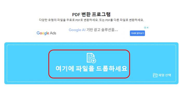 (3) 변환을 하고자 하는 pdf파일을 하늘색창에 있는 '여기에 파일을 드롭하세요' 버튼 쪽으로 드래그하여 오거나,